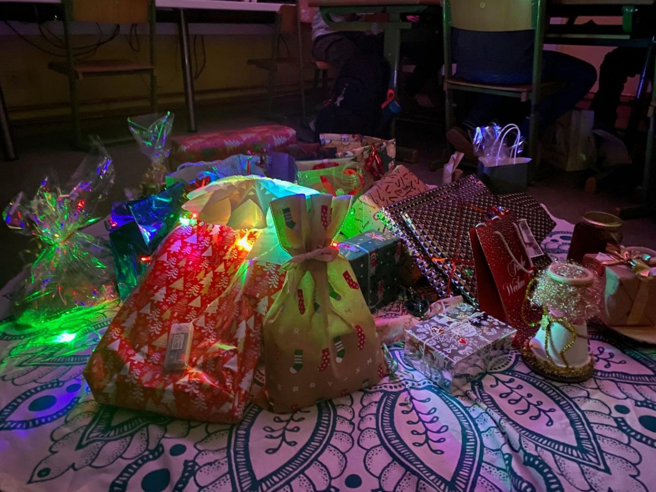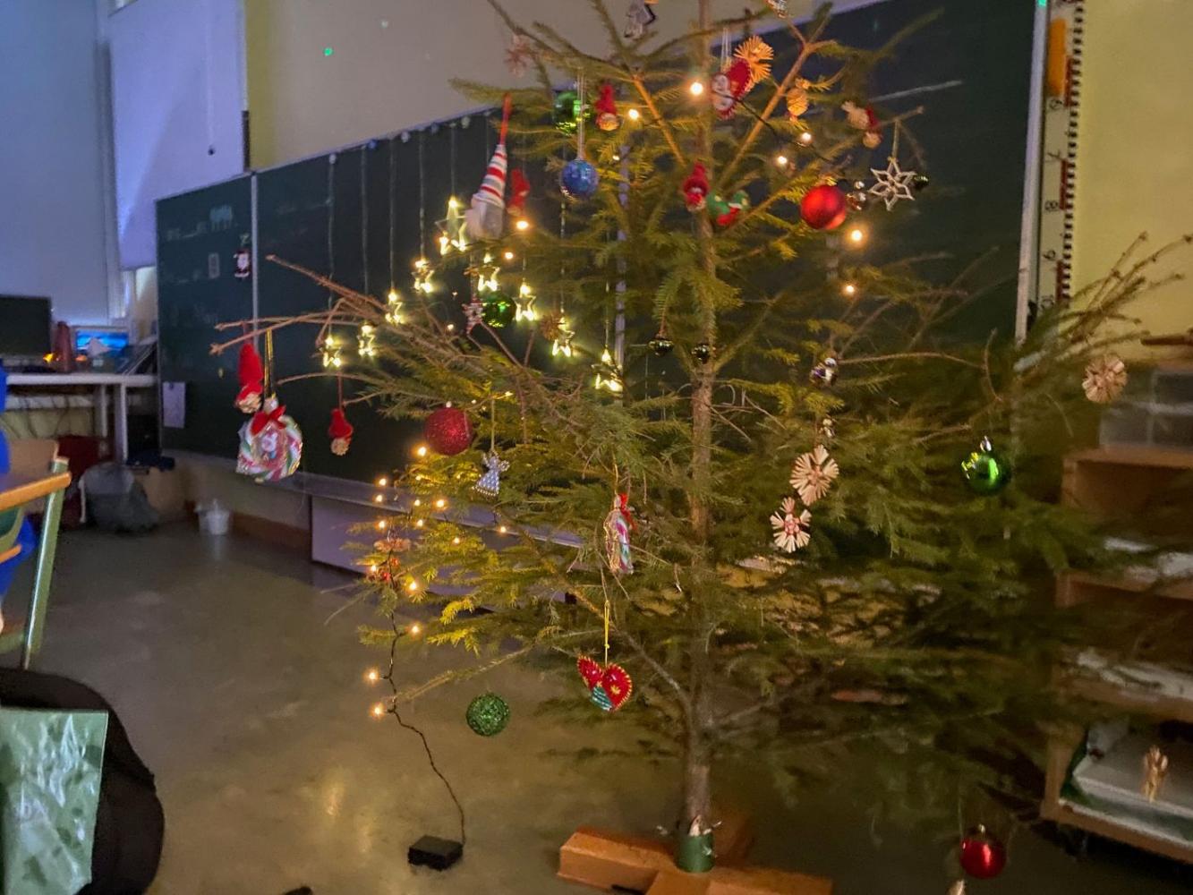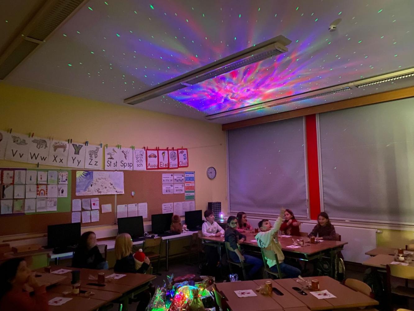 Anschließend schmückten wir gemeinsam den Weihnachtsbaum und schalteten einen Projektor in der Klasse ein – die Atmosphäre erinnerte an einen funkelnden Sternenhimmel.